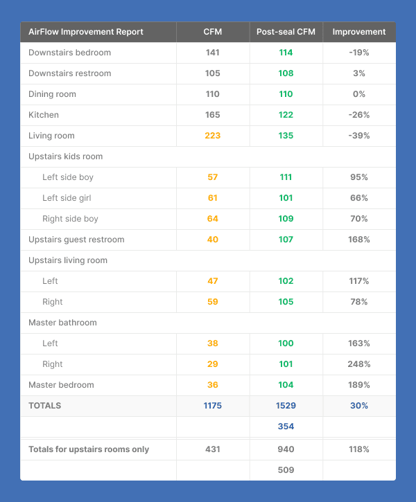 See room-by-room airflow data before and after sealing.
